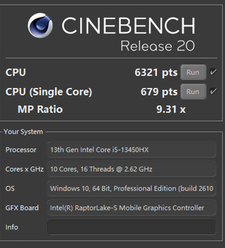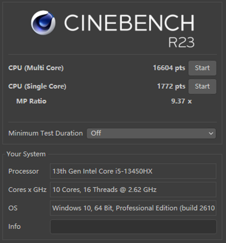 在体现处理器性能的Cinebench R20中,这款机型超频状态下单核成绩为679pts,多核成绩为6321pts,Cinebench R23测试中,测得单核成绩为1772pts,多核成绩为16604pts,和12600KF的处理器水平相当(成绩出入约1%,可忽略不计)。