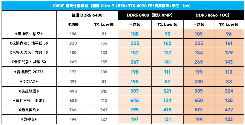 那么在游戏实测中,这对高频DDR5 CUDIMM内存套装又能带来多少提升呢?从我们的实测来看,即便是在默认的DDR5 8400频率下,测试的10款游戏不但平均帧明显高过使用常规DDR5 6400内存,决定游戏顺滑度的1% Low帧的优势甚至更加明显。可见高频内存不但能带来更高的帧率,也能带来更高的流畅度,对于游戏体验的提升效果也是很给力的。此外,在超频到DDR5 8666之后,平均帧和1% Low帧也得到了小幅提升,对于玩家来说,也是一个免费的福利。