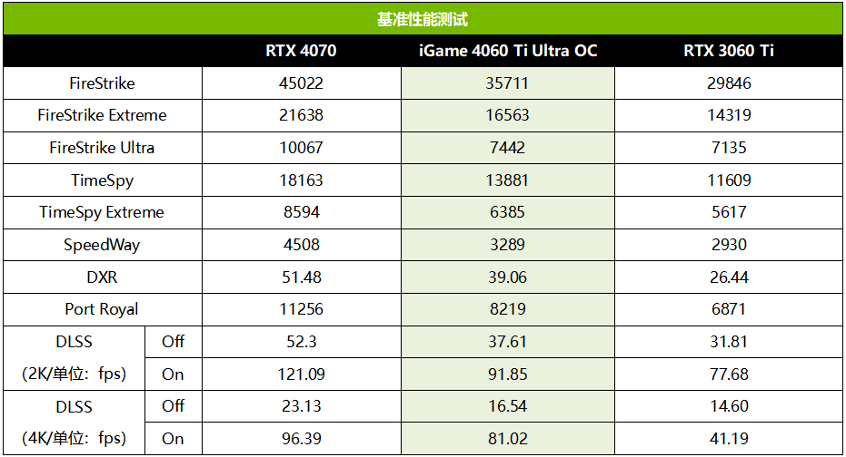 首先来看看3DMark基准测试的情况。基于DX11的FireStrike系列测试中,iGame GeForce RTX 4060 Ti Ultra W OC 8GB在1080P分辨率的FireStrike项目中、2K分辨率的FireStrike Extreme项目中,都领先RTX 3060 Ti 14%以上,即使在显存因素影响权重更大的4K分辨率FireStrike Ultra项目中也保持了对RTX 3060 Ti的领先。