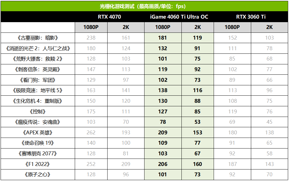 光栅化游戏实测部分,综合下来,iGame GeForce RTX 4060 Ti Ultra W OC 8GB平均领先RTX 3060 Ti大约15%。