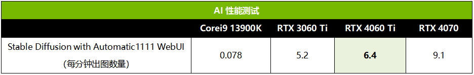 对于有视频应用需求的用户来讲,内置第8代NVIDIA编码器的RTX 4060 Ti相对RTX 3060 Ti也增加了AV1硬件编码,在视频剪辑和串流中都能提供比H.264编码更高的画质和更低的带宽占用。而对于目前热门的AI应用,拥有Ada Lovelace新特性与无可比拟的CUDA生态圈优势的RTX 4060 Ti也是一款性价比非常高的甜品装备。