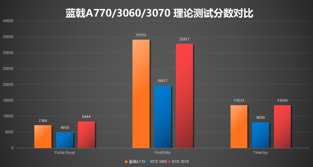 用3D Mark软件进行跑分测试,蓝戟A770 Photon的理论测试分数相较于同价位的RTX3060大幅领先,甚至无限接近RTX 3070的性能表现。三项测试中,只有Portal Royal光追性能测试中,RTX 3070相较于蓝戟A770 Photon领先17%,其他两项蓝戟A770 Photon甚至有小幅领先。蓝戟A770 Photon能够实现越级的性能表现,16G大显存在其中自然发挥了不可忽视的作用。