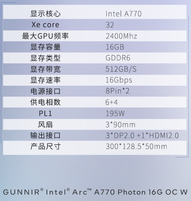 极致的外观之下,蕴含着蓝戟硬核的产品实力。蓝戟A770 Photon拥有32个Xe核心加持,GPU频率最高可达2400MHz。16G GDDR6显存是畅玩3A大作的保证,显存位宽256-bit也毫不缩水。A770出色的性能对于喜欢体验新游的玩家来说再适合不过了,超大显存容量可以轻松应对3A级别的游戏大作,做到高特效高画质畅玩。输出接口仍然采用一个HDMI2.0加上三个DP2.0的方案,最高支持4K120Hz以及8K60Hz的显示输出,多屏协同的游戏和生产等需求也能满足。