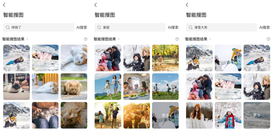 难得的是,自然语言搜索也能精准直达。在这里编辑测试了“家庭”“摔倒了”“滑雪大笑”等词,都能快速搜索到对应的照片。