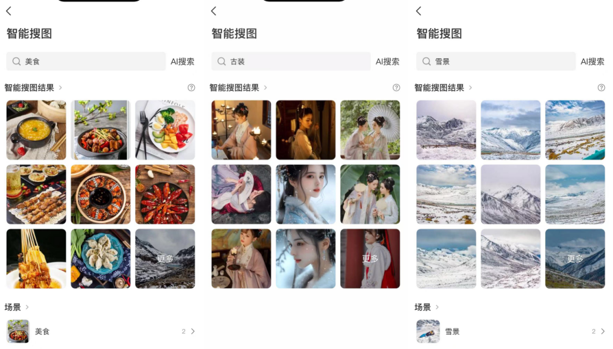 常见词搜索照片,譬如美食、古装、雪景等等,都能快速搜索到精准结果。