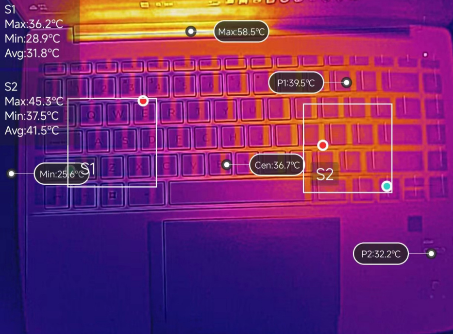再说说C面温度(性能模式)表现:整个C面大部分区域处于40℃以下,热量堆积区域在按键L和回车键之间,最高大概是45℃,这部分区域热感稍微明显一些,总体温度不高。