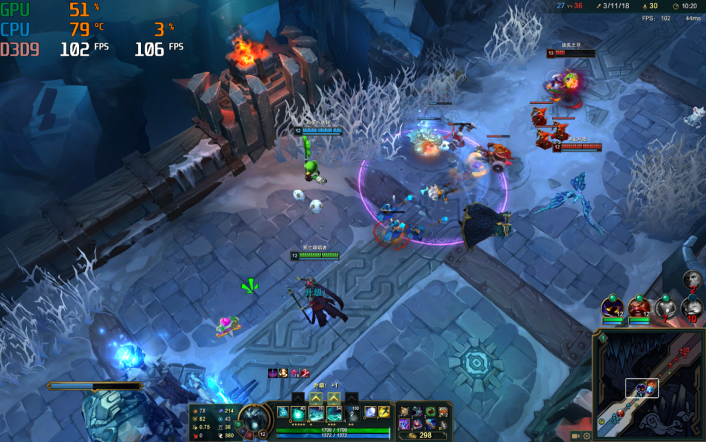 ▲游戏实战,《英雄联盟》大乱斗地图,1200P最高画质,游戏运行10分钟,平均帧速106fps,流畅度不错。