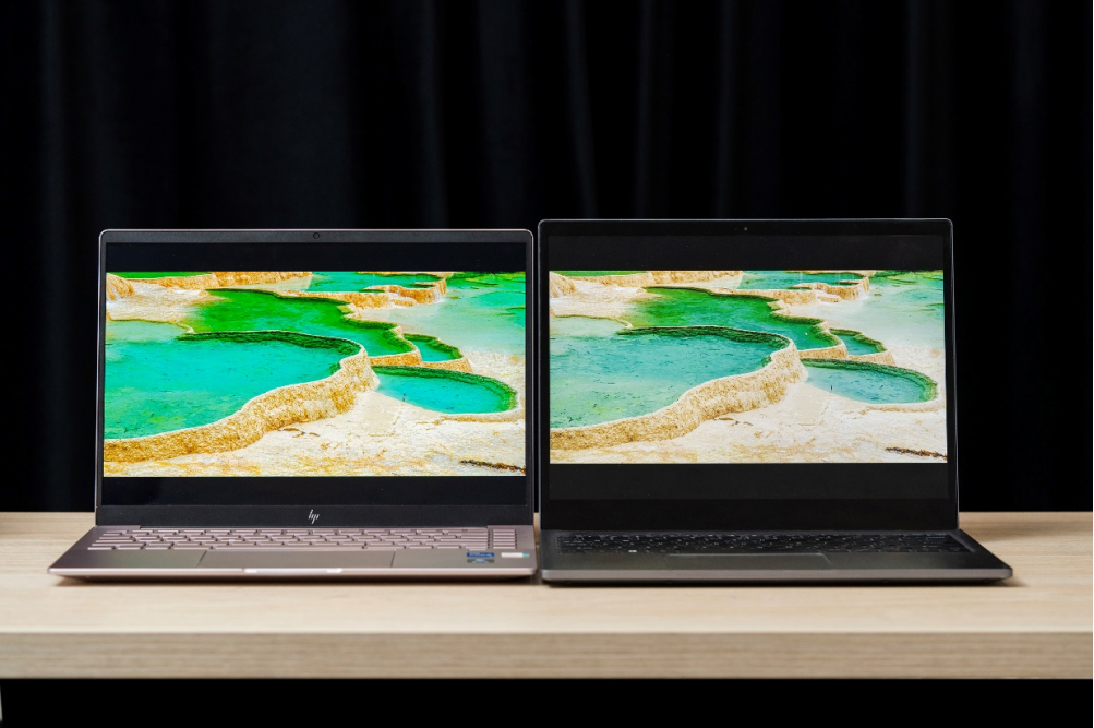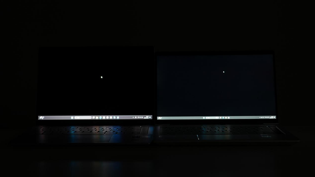 ▲左侧星Book Pro 14的OLED因为自发光特性,能显示真正的黑色,日常使用时视觉效果更好。而右侧LCD液晶层不能完全关合,在显示黑色时,会有部分光穿过颜色层,所以用户通过LCD屏幕看到的黑色,实际上是白色和黑色混合的灰色,会感觉画面偏灰,且屏幕还会出现漏光的情况。