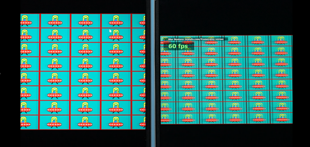 ▲TestUFO可以识别显示器刷新率并匹配相应的fps,左侧是星Book Pro 14的90Hz屏幕,清晰流畅,右侧普通轻薄本的60Hz屏拖影较明显。