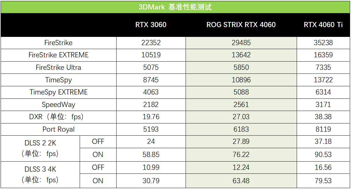 根据3DMark GPU的测试结果,ROG STRIX RTX 4060的性能优势相比上代的RTX 3060还是比较明显的,FireStrike系列测试中,平均提升幅度为26%,在1080P和2K分辨率的FireStrike、FireStrike EXTREME项目中的都保持了30%以上的领先优势,TimeSpy系列测试则有25%的提升。在DX12U专属的SpeedWay测试中,ROG STRIX RTX 4060比RTX 3060高出17%。