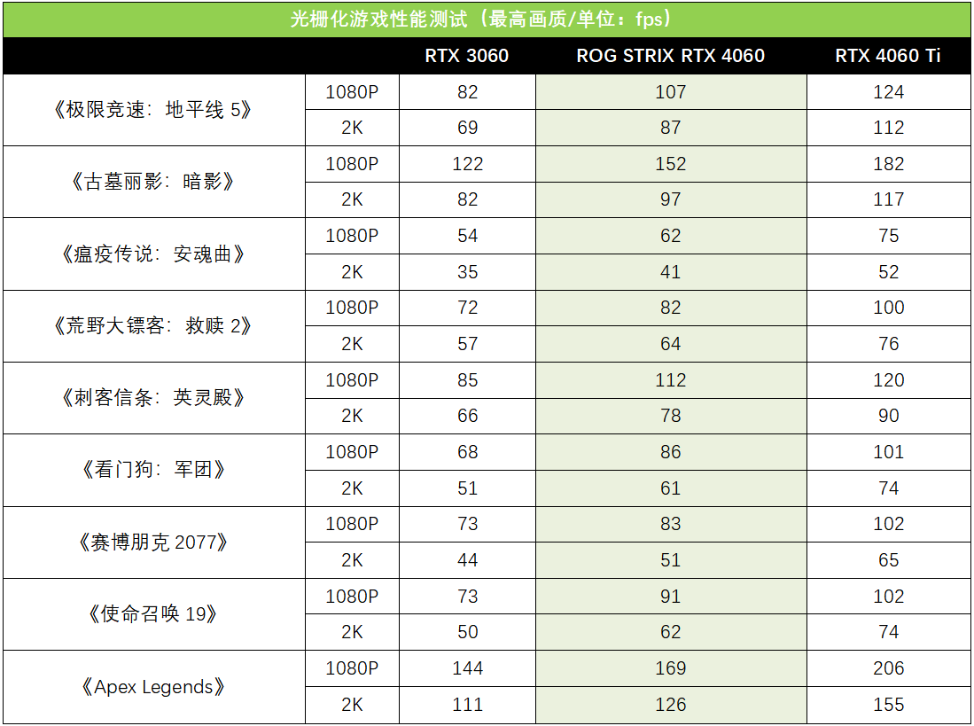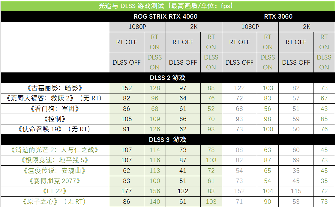 接下来我们进入实际的游戏测试,测试中,我们加入了2K游戏分辨率的测试成绩。首先是传统的光栅化游戏,在1080P分辨率下,ROG STRIX RTX 4060平均帧率相对RTX 3060提升了22%左右,《极限竞速:地平线5》《刺客信条:英灵殿》《看门狗:军团》的领先幅度在26%以上。分辨率来到2K之后,ROG STRIX RTX 4060的领先幅度有所降低,平均领先RTX 3060 18%左右。但如果具体到帧率上,ROG STRIX RTX 4060在2K分辨率、最高画质下,《荒野大镖客:救赎2》《看门狗:军团》《使命召唤19》都可以达到60fps以上的帧率,而RTX 3060则无法在这三款游戏中稳定60fps。