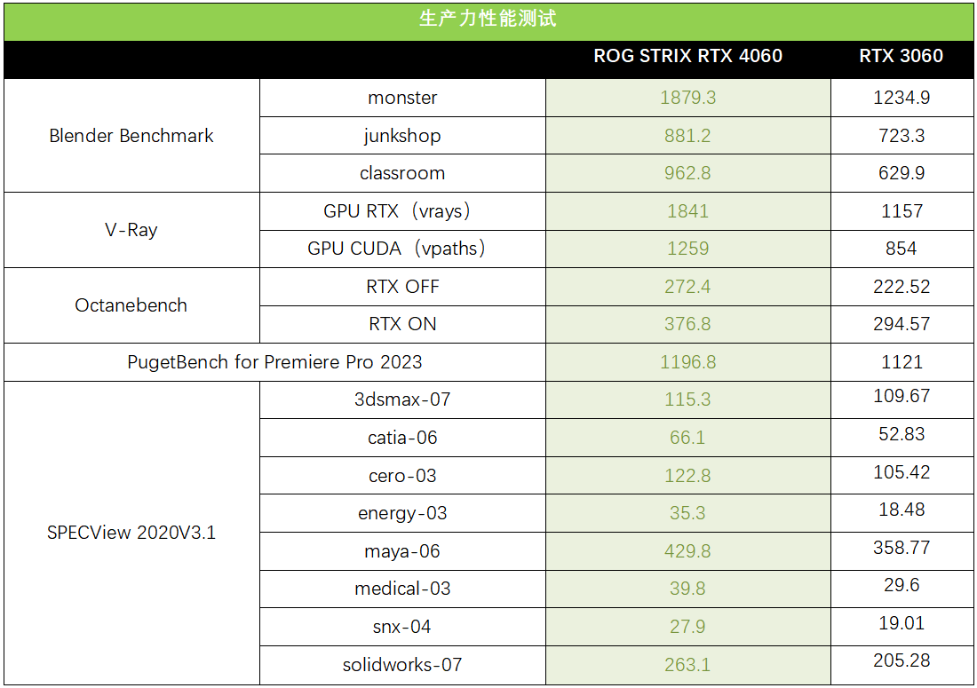 接下来看看生产力方面的表现,从测试结果来看,ROG STRIX RTX 4060在Blender Benchmark中对比RTX 3060提升比较明显,三个渲染场景的平均提升幅度为42%。在V-Ray中无论是使用RTX还是CUDA相对于RTX 3060都能实现45%以上的渲染效率提升,而OC渲染器中的性能提升最高达到26%。视频剪辑方面,使用PugetBench for Premiere Pro 2023插件,ROG STRIX RTX 4060也是强过RTX 3060的。SPECView包含了大量的工业软件测试项目,在2020V3.1版本中,ROG STRIX RTX 4060相对RTX 3060的提升在4%~103%之间,平均领先RTX 3060 39%。