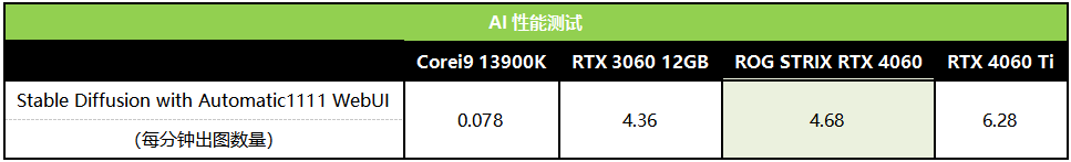 AIGC即人工智能自动生成内容,被认为是继专业生产内容(PGC)、用户生产内容(UGC)之后的新型内容创作方式,未来AI必将成为日常工作必须掌握的技能。NVIDIA很早就开始布局AI计算,到了RTX 40时代,更是成为了AI应用的必备利器。这里我们就用Stable Diffusion来测试ROG STRIX RTX 4060在AI出图方面的性能。从测试成绩可以看到,ROG STRIX RTX 4060每分钟可以出图4.68张,是i9 13900K纯CPU方案的59倍以上,领先RTX 3060 7%,效率达到了RTX 4060 Ti的75%。可见拥有第三代RT Core和第四代Tensor Core的ROG STRIX RTX 4060可以称得上是甜品级生产力工具。
