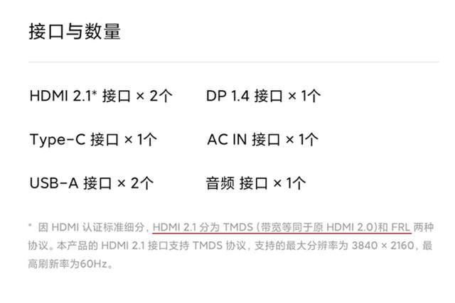 现在的中高端显示器基本标配了HDMI 2.1接口,理论上大家购买显示器时认准这个规格就可以无脑选择了。可是在去年,HDMI组织放宽了对HDMI 2.1标准的认定,把HDMI 2.0这个概念给取消掉了,反而把HDMI 2.1变成了两套协议。其中HDMI2.1 FRL就是原来的HDMI 2.1,带宽为48Gbps;而HDMI 2.1 TMDS则是原来的HDMI 2.0,带宽为18Gbps。