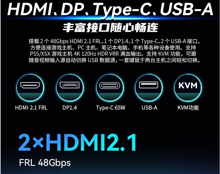 新的认定规则显然给了厂商凭空创造卖点的机会,如今很多显示器、电视等厂商在原HDMI 2.0的宣传上已基本改用HDMI 2.1代替,你买的HDMI 2.1设备很有可能就是原来的HDMI 2.0。HDMI 2.0虽然能够在降低色度采样的情况下满足4K/120Hz的带宽需求,却并不支持HDMI 2.1的其他特性,要是你同时还有用显示器连接XBOX和PS5游戏主机的需求,那至少要选择采用HDMI 2.1 FRL接口并注意是否支持如VRR和ALLM自动低延迟模式等可选功能。