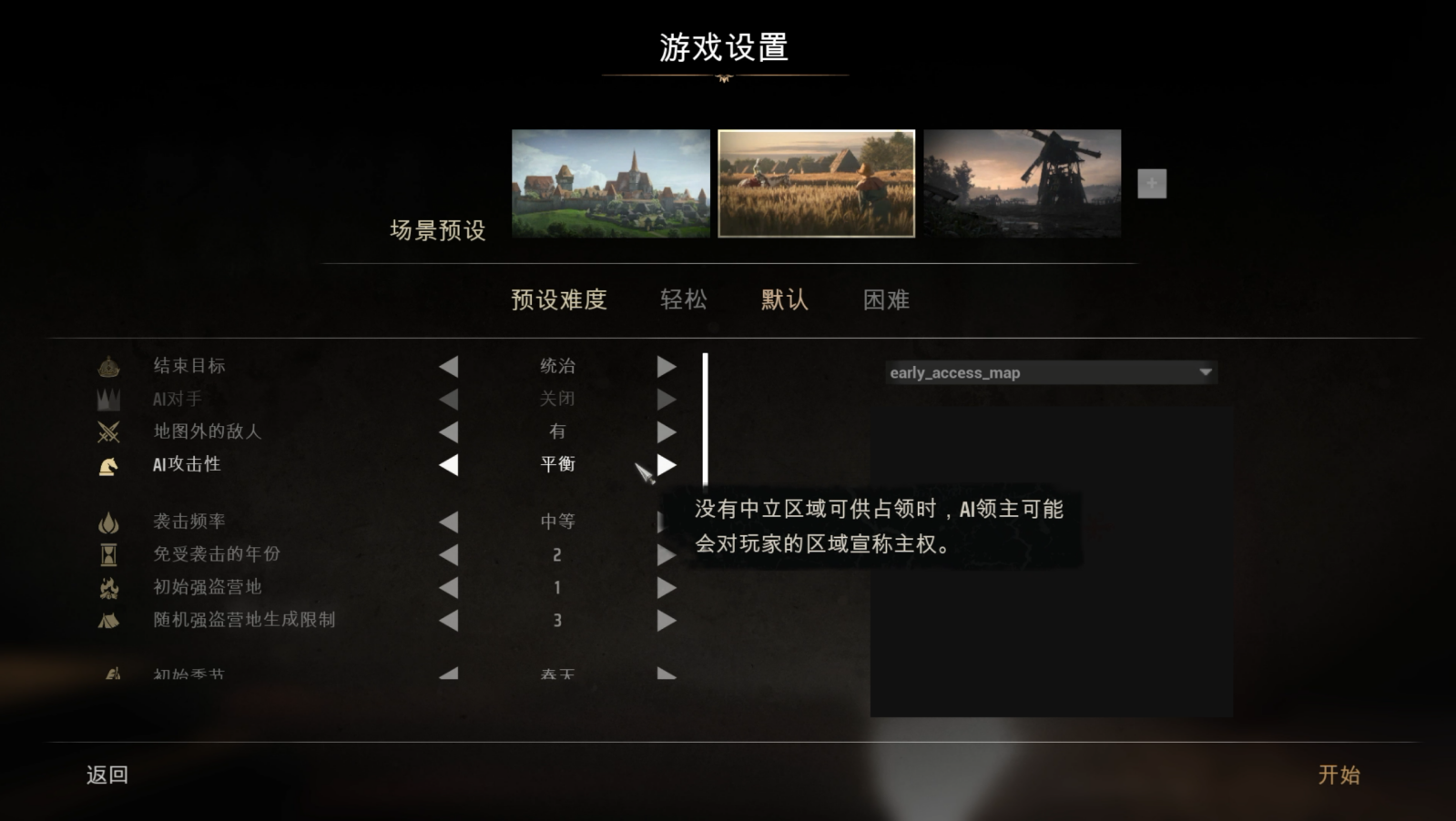 当前版本的《庄园领主》开局有三种场景模板,地图只有一个,游戏难度可以自行调节,通关玩法基于建造与战斗征服。如果是新手家或者是纯“种田”玩家,建议选择“昌盛之旅”模式,这个模式下没有战斗任务,只需要埋头“种田,最后将城镇规模升到大型城市就可以通关了。