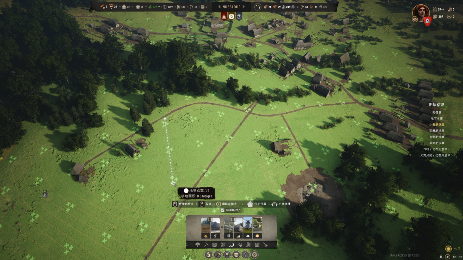 和大多数模拟经营策略游戏一样,游戏开局只有几个拓荒者和有限的物资。你需要像一个真正的中世纪领主那样从头开始建立住宅、伐木场、狩猎营地、道路等等,还要考虑布局规划、设施配套等要素。同时,游戏里各种建筑的建设也没有太多限制,大部分类型的基础建筑都能随时建造,你可以根据领地里的资源情况来重点发展农业、工业和养殖业。游戏的引导系统还不是很完善,大多数时候需要靠玩家自己去摸索玩法,但这也意味着游戏的自由度很高,玩家可以很好地享受游戏带来的乐趣。