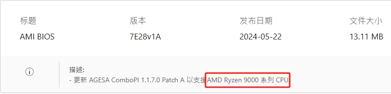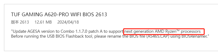 而在主板的BIOS支持方面,厂商也展现出了很高的积极性。在技嘉、华硕、微星的官网中,可以看到A620主板产品大概在4~5月份就推送了锐龙9000系处理器的升级BIOS,并放出了主板的兼容列表。从更新描述可以看到,各家的新BIOS重点保证稳定性和性能方面的问题,确保用户使用在新的锐龙9000系处理器时能够获得流畅可靠的性能表现。