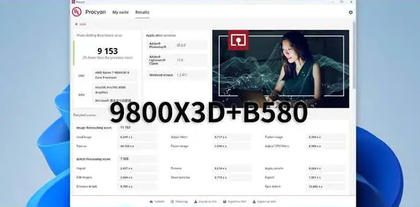 在调用Adobe PhotonShop+Lightroom的UL Proycon Photo模组,AMD 9800X3D+蓝戟 B580,测试得分为9153。
