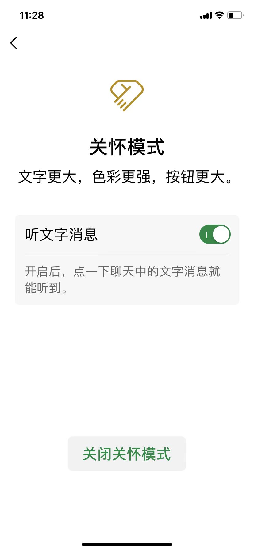微信关怀模式内上线“听文字消息”功能。用户在关怀模式下开启听文字功能后,点击聊天中的文字消息即可听到语音朗读,帮助长辈们或有视力障碍的用户更方便地使用微信。目前已于安卓、IOS已经基本全部覆盖,微信更新到最新版本即可体验。