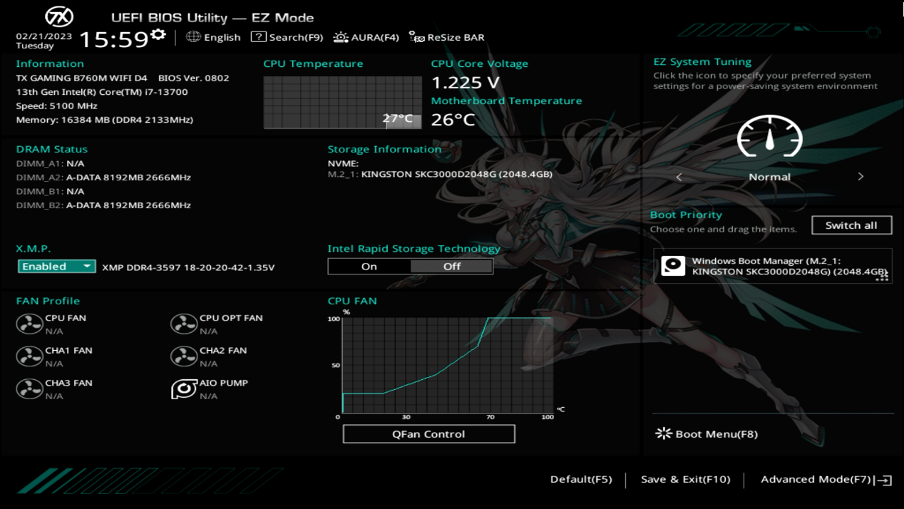 除了主板外观上的“小心思”,华硕B760天选主板的BIOS界面和相关配套软件都有天选姬新造型的画面,能够给玩家带来更加沉浸的二次元体验。