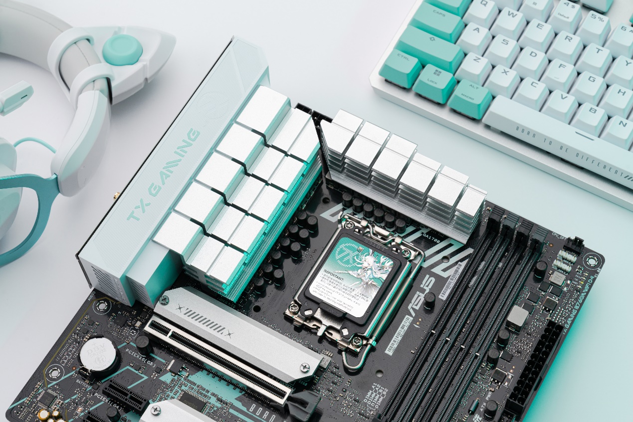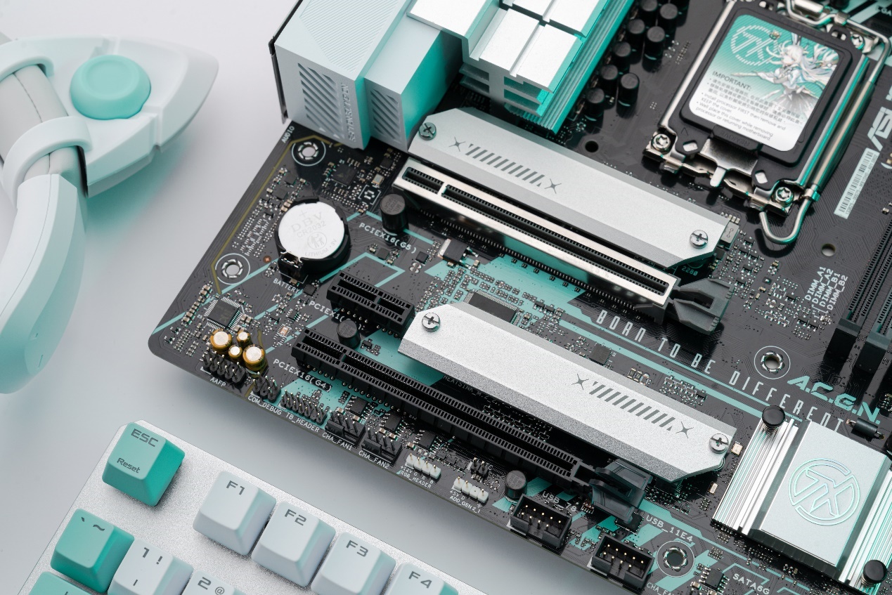 主板配备了大面积月光银装甲,和“天选姬”的战甲相呼应,PCB上专属的魔幻青配色更是体现了该主板的主题。芯片组散热片上,华硕还为该主板加入了钻切工艺打造的TX LOGO,特别带感。此外,PCB上还印有“Born to be different”、“A.C.G.N”和“华硕天选”等专属字样,处处显现出与众不同的二次元风,将主板设计带进了次元美学新高度。