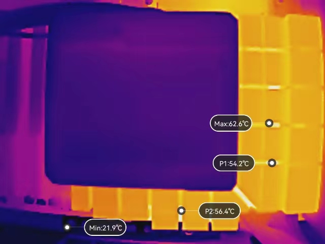 在室温24℃、无辅助散热的环境下,我们使用R23进行30分钟的连续考机,可以看到酷睿i7 13700可以在华硕B760天选主板上稳定在性能核5.1GHz、能效核4.1G的频率上。此时用热成像仪查看主板的供电温度,可以看到测温点最高温度为62.6℃,整体表现能够满足玩家们高负载下使用的需求,不用担心温度问题。