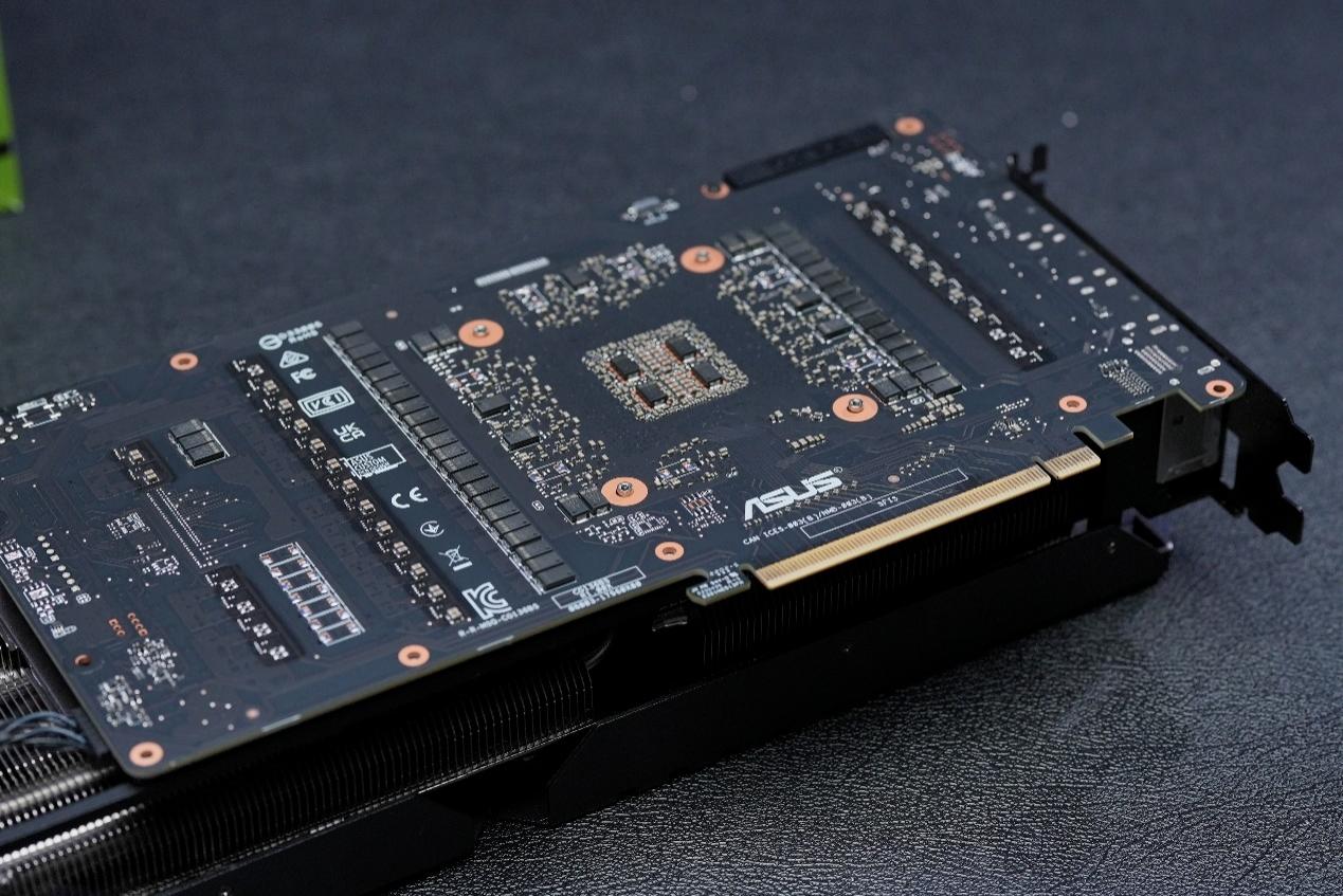 从拆解我们也可以看到,华硕TUF-RTX3090Ti-O24G-GAMING采用了更高密度的显存颗粒,PCB上只有正面的12颗显存,背面不再有显存(RTX 3090在背面设计有显存),也从侧面减少了显存发热。