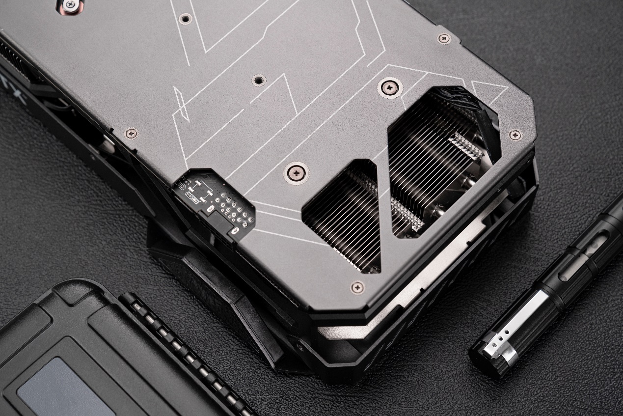 显卡散热器底座采用了MaxContact镜面直触技术,将表面打磨得如镜面一样的平滑,从而让底座和GPU的贴合更紧密。此外,显存部分采用了单独的散热模组,能进一步降低GDDR6X显存的温度,带来更好的使用体验。