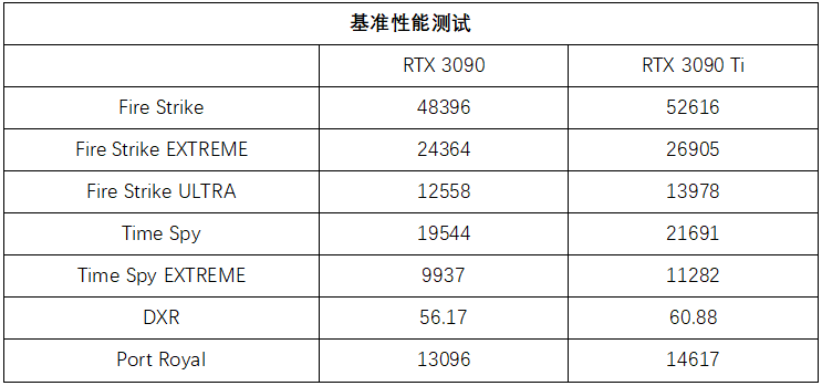光线追踪测试方面,在混合光追计算的Port Royal场景中,华硕TUF-RTX3090TI-O24G-GAMING相比RTX 3090的提升达到了12%,而在纯光追计算的DXR光线追踪测试场景中,也有着8%的帧速优势。从理论测试来看,华硕TUF-RTX3090TI-O24G-GAMING相对于RTX 3090的提升还是比较明显的。
