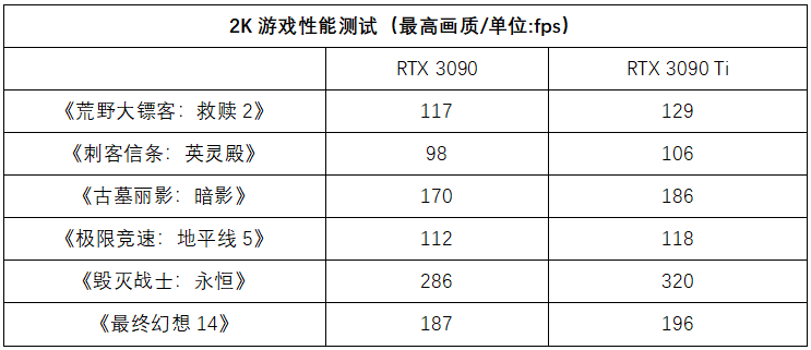 随着分辨率提升到2K,华硕TUF-RTX3090TI-O24G-GAMING相对于RTX 3090的性能提升就开始逐渐变得明显。大部分游戏的提升都在10%左右,除了《最终幻想14》这样的网游依旧遇到了处理器瓶颈,性能提升只有5%。