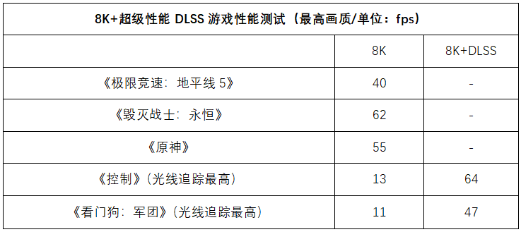 当然,如果在需求较高的3A大作中再开启光线追踪,那么显卡的压力就会剧增,原生状态下的帧速表现就会有些不尽如人意了。所以NVIDIA也为8K分辨率游戏提供了缩放倍数更高的DLSS Ultra Performance超级性能模式。