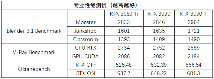 除了有着超强的游戏性能表现,RTX 3090 Ti同样有着TITAN级的内容创作能力。我们选用了目前知名度和使用率都非常高的3D建模与渲染软件Blender、V-Ray渲染引擎和OctaneRender渲染器进行测试。从测试来看,凭借满血的GA102核心,华硕TUF-RTX3090TI-O24G-GAMING在进行生产力内容创作时相比RTX 3090也有着更强的性能,在这三款软件中的基准性能提升也达到了4%~8%。