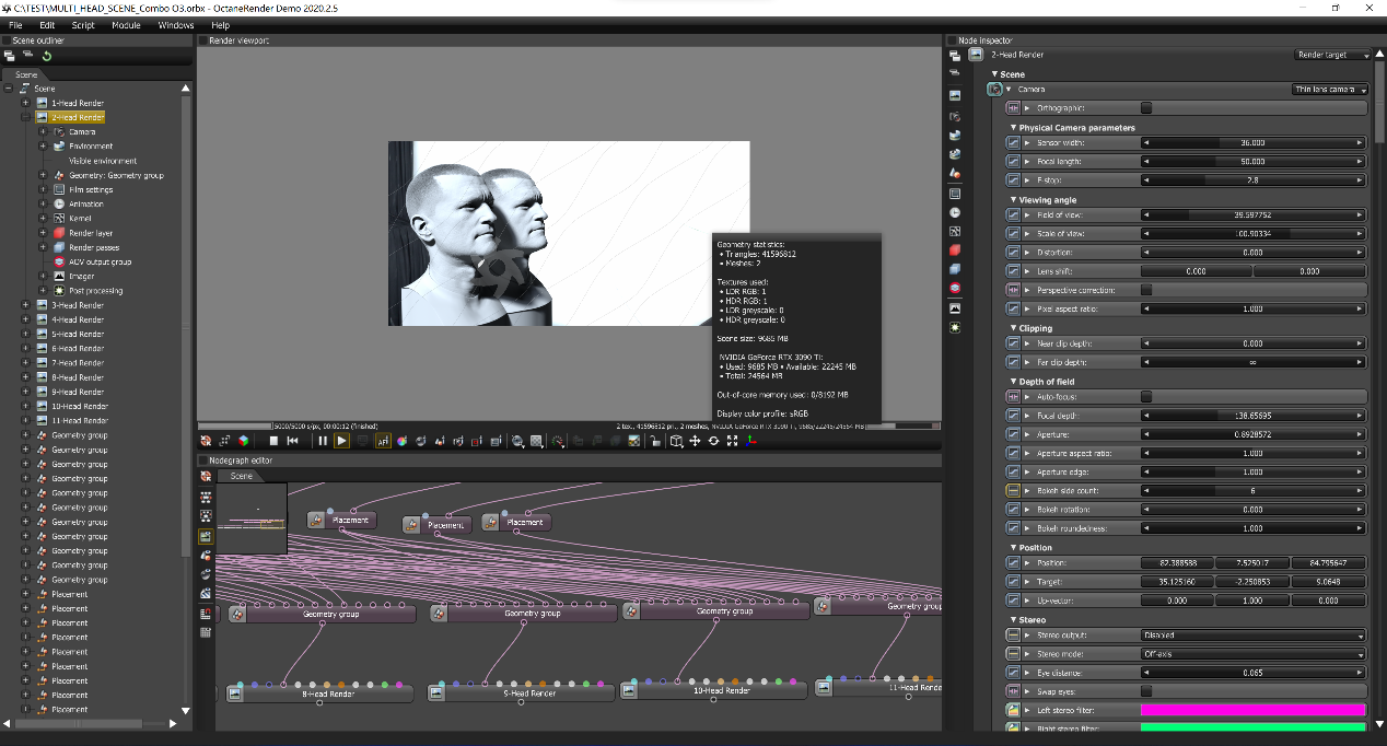 在OctaneRender渲染器的Demo独立版中,我们载入一个较大的场景文件并进行渲染。华硕TUF-RTX3090TI-O24G-GAMING仅使用12秒就完成了渲染,没有使用系统内存进行核心外渲染。