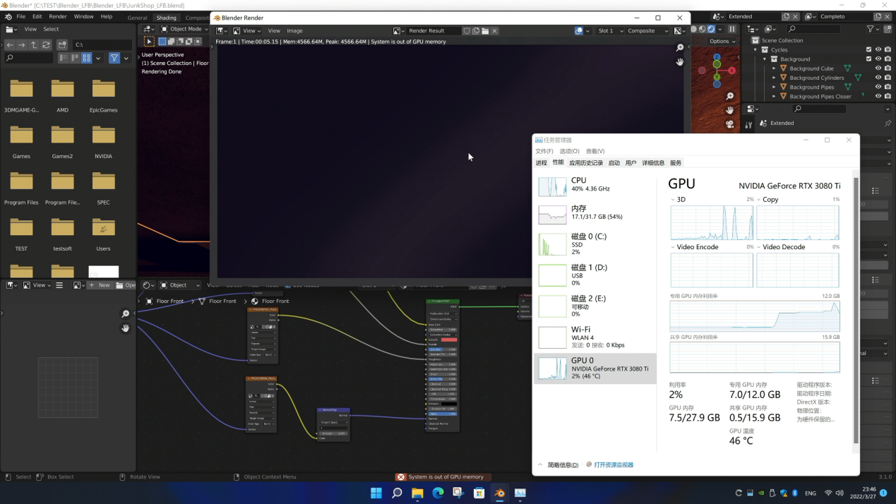 同样,在Blender的交互式渲染中,大显存的RTX 3090 Ti也有更好的表现。我们载入了一个383MB的官方Demo,并选择使用Optix GPU渲染。华硕TUF-RTX3090TI-O24G-GAMING很快完成了渲染(相较于CPU渲染大幅节省时间),从资源管理器我们可以看到,此时占用了14.2GB显存,显然这已经超过了RTX 3080 Ti的显存容量。