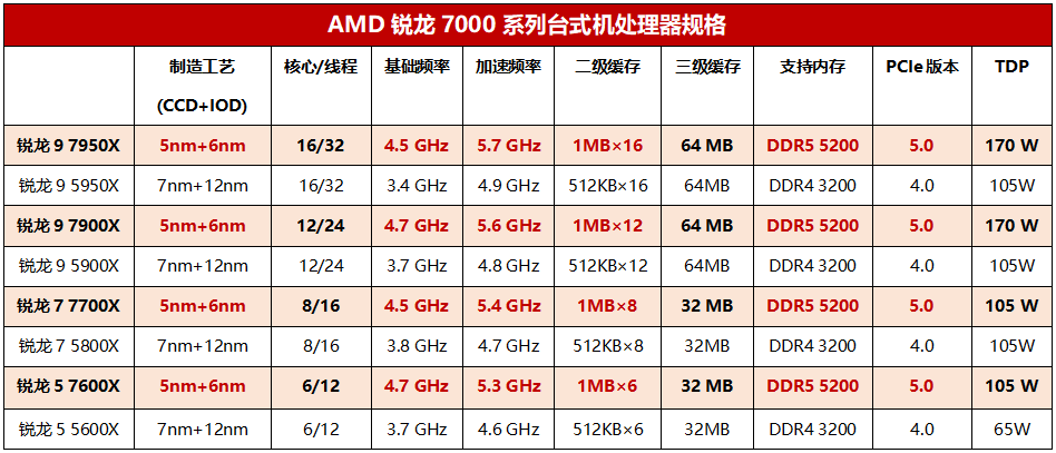不过,Zen4架构的锐龙7000处理器在性能猛增的同时,TDP方面也有了明显的增加。从表中可以看到,双CCD的两款锐龙7000的TDP从上代的105W提升到了170W,而甜品级的锐龙5 7600X也从上代的65W提升到了105W。这就对主板的供电能力与稳定性提出了更高的要求。