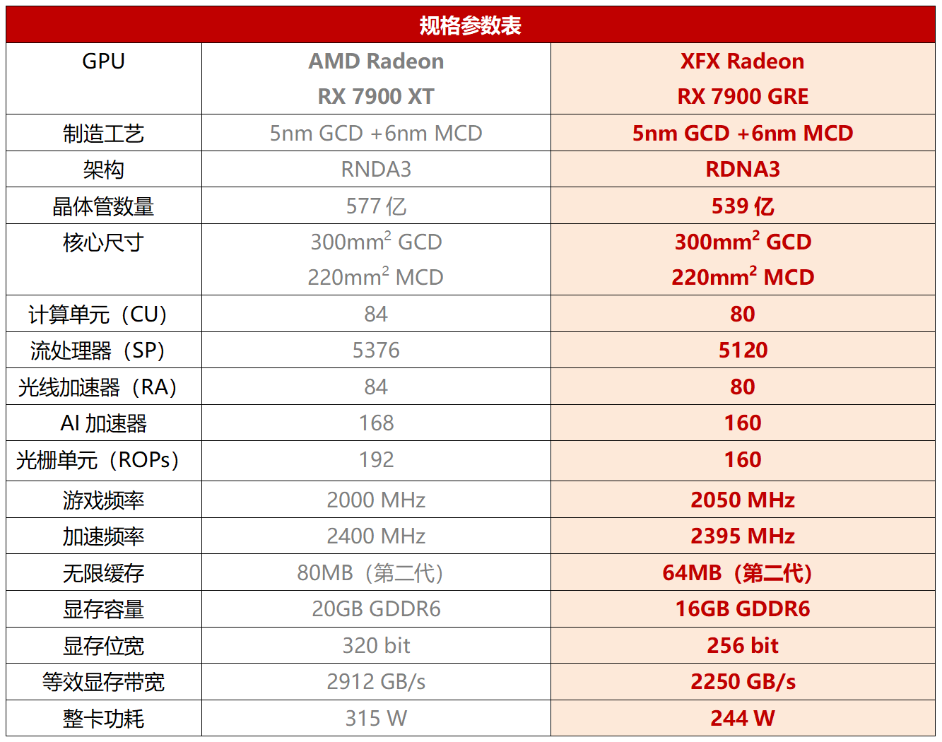 从命名就可以看出来,Radeon RX 7900 GRE位于Radeon RX 7900 XT与Radeon RX 7800 XT之间,属于RX 7900旗舰队伍的“守门员”。而从具体的硬件参数来看,Radeon RX 7900 GRE相对Radeon RX 7900 XT精简了4组CU单元、256个流处理器、8个AI加速器,缩减幅度还不到5%,只有光栅单元缩减幅度稍高,接近17%。此外,Radeon RX 7900 GRE的无限缓存为64MB,显存位宽为256 bit,显存容量为16 GB,如此一来Radeon RX 7900 GRE既与Radeon RX 7900 XT拉开了定位,又保证了它依然拥有可以驾驭4K游戏大作的旗舰级实力。