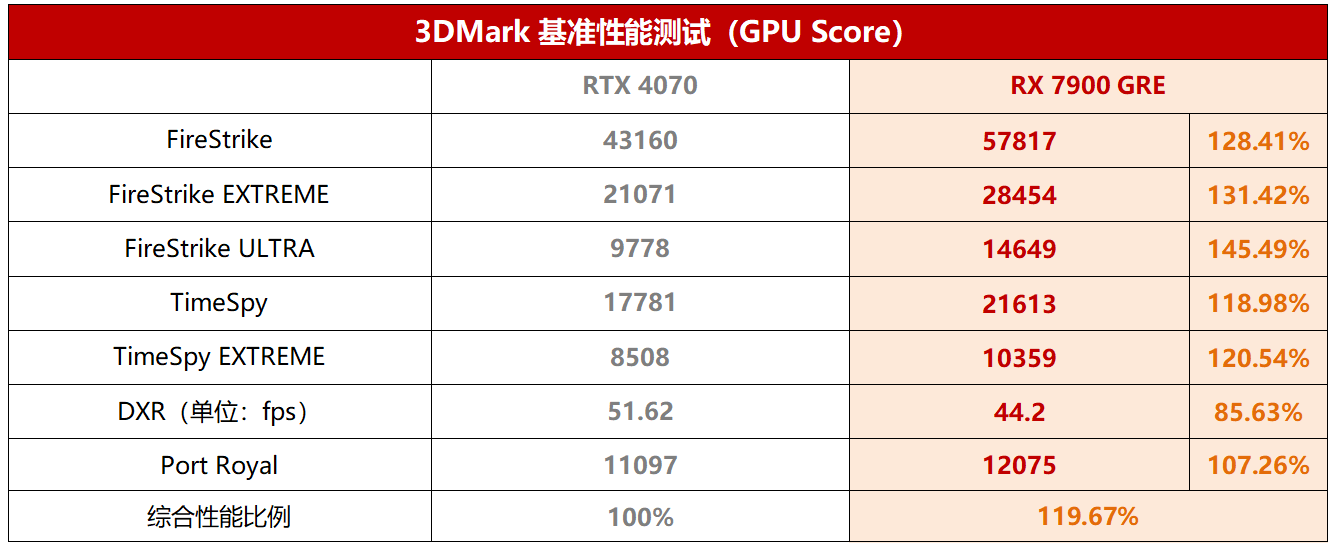 基准性能部分,可以看到,无论是在DX11的FireStrike项目还是DX12的TimeSpy项目中,RX 7900 GRE都以明显的优势领先RTX 4070,分辨率越高,领先幅度越大,特别是在4K分辨率的FireStrike ULTRA项目中,领先幅度已经超过了45%。在DXR光追测试项目中,RX 7900 GRE可以达到RTX 4070大约85%的性能,而在Port Royal中甚至反超了RTX 4070,优势达到7.26%,可见RDNA3第二代光线加速器在效率方面进步很明显,已经可以和竞品发展了三代的光追一较高下了。