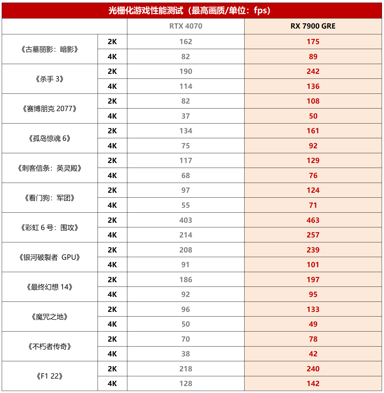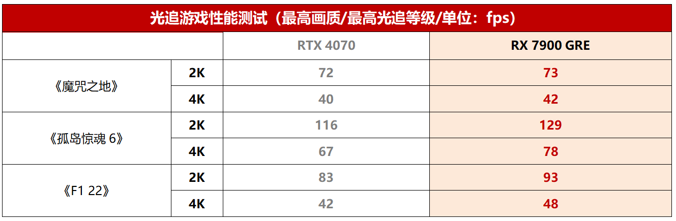 光栅游戏部分,RX 7900 GRE相对RTX 4070的优势可以说是非常明显了。在《赛博朋克2077》中的优势甚至超过了30%,4K下更是超过35%。在《杀手3》《孤岛惊魂6》《看门狗:军团》《彩虹6号:围攻》中都有20%左右的优势,在其它游戏中也保持了10%左右的优势。综合下来平均优势为16.73%。由此可见,在光栅游戏中,RX 7900 GRE的性能基本上高出了RTX 4070一个档次。此外,我们也可以看到,4K分辨率下,在大多数3A游戏中,RX 7900 GRE都可以保持平均70 fps以上的流畅帧率,证明它确实是一款能够HOLD住4K游戏大作的旗舰级显卡。
