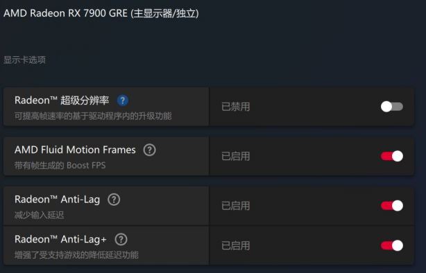 ▲在驱动程序面板中打开AFMF功能,建议同时打开Radeon Anti-Lag和Radeon Anti-Lag+降低帧延迟