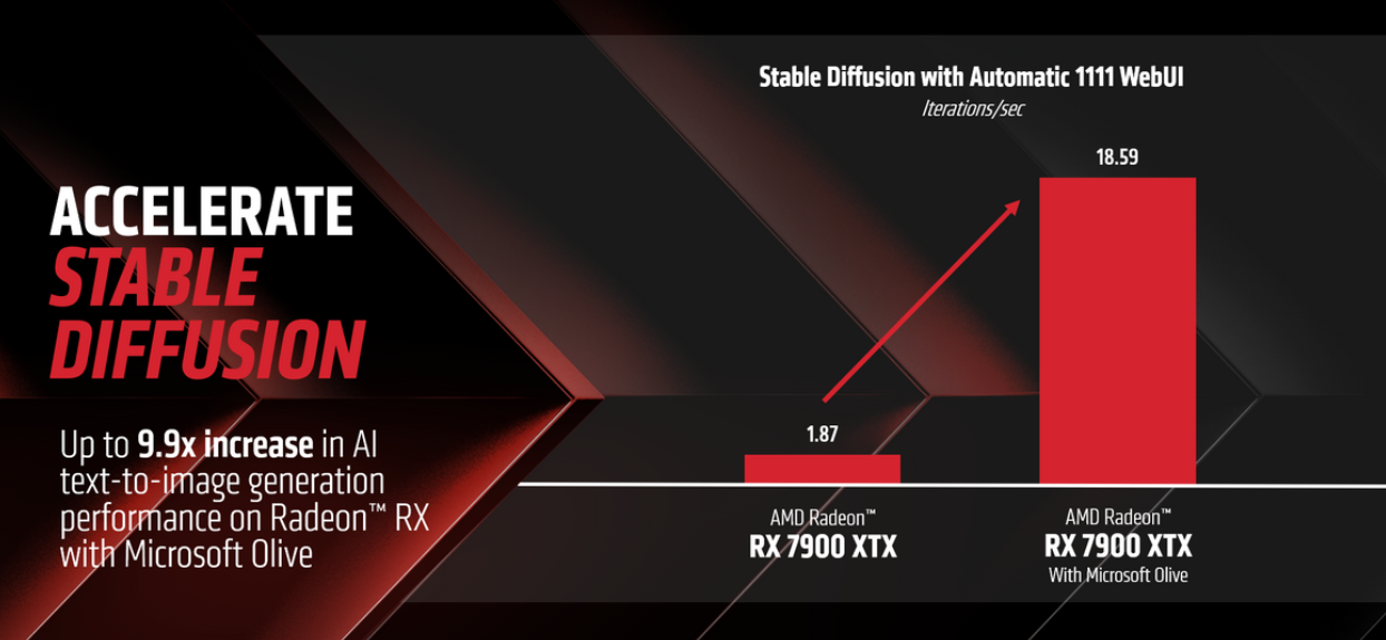 ▲通过微软Olive对模型的优化,RX 7000显卡在Stable Diffusion中的文生图效率最多可提升到原来的9.9倍