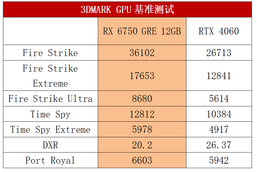 在3DMARK基准测试中,我们可以看到在A卡的传统优势项目FireStrike系列中,蓝宝石RX 6750 GRE 12G D6极地版有很明显的优势,其中在4K分辨率的FireStrike Ultra,领先幅度达到了55%,在2K分辨率的Fire Strike Extreme中,也有37%的领先优势。DX12的Time Spy测试项里,RX 6750 GRE 12GB对比RTX 4060的领先幅度就没有这么夸张了,Time Spy和Time Spy Extreme项目中分别比RTX 4060强了23%和22%,依然保持了不小的优势。在针对光线追踪的DXR测试中,RX 6750 GRE 12GB落后RTX 4060 23%,但在Port Royal测试中,RX 6750 GRE 12GB实现了反超。