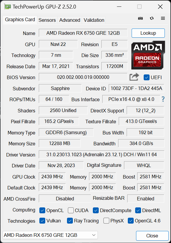 Radeon RX 6750 GRE 12GB采用的是Navi 22核心,计算单元的数量为40个,拥有了2560个流处理器、40个光线加速器以及64个光栅单元,产品的游戏频率为2439MHz,加速频率为2581MHz。显存规格方面,Radeon RX 6750 GRE 12GB拥有12GB GDDR6显存,无限缓存容量为96MB。不难看出,Radeon RX 6750 GRE 12GB在计算单元数量、流处理器数量、光线加速器数量、光栅单元数量、显存容量等规格方面和Radeon RX 6750 XT非常的接近,主要区别在于频率和功耗略低于后者。