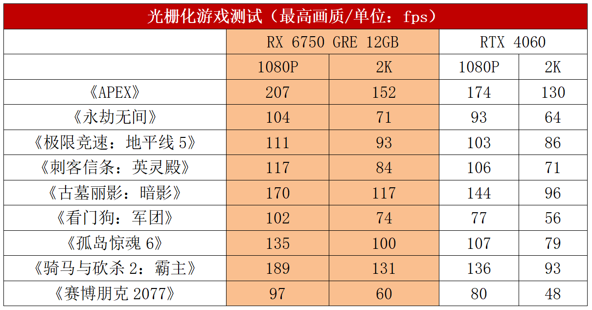 我们先来看看1080P游戏的表现,从测试成绩中可以看到,蓝宝石RX 6750 GRE 12G D6极地版在1080P分辨率下对比RTX 4060有着很明显的领先的优势,其中《看门狗:军团》《骑马与砍杀2:霸主》的帧率分别比RTX 4060高32%、39%,平均领先RTX 4060 21%。而在2K分辨率下,RX 6750 GRE 12GB和RTX 4060的帧率差距进一步拉大,《骑马与砍杀2:霸主》的领先幅度达到了41%,平均领先RTX 4060 22%。