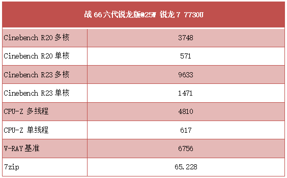 战66六代锐龙版搭载的锐龙7 7730U比较强力,在大家熟悉的Cinebench R20多核中,其多核测试成绩为3748pts,在Cinebench R23多核中测试中,多核成绩达到了9633pts。这是一个什么层次的水平呢?一般来说,轻薄本上6核12线程锐龙H处理器也就跑3300/8500左右,显然该机的表现超过了后者。这也意味着所有的日常应用,包括上网看视频、office办公应用、编程、Ps图片处理等等都可以轻松搞定,短时间的高负载应用也可偶尔胜任,比如短视频剪辑,学习3D渲染等等。