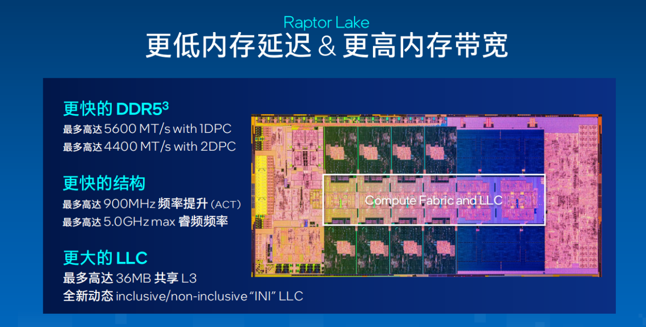 Raptor Lake-S在内存控制器方面也进行了升级,支持的基础频率从DDR5 4800升级到了DDR5 5600,环状总线频率也最多提升了900MHz,最高可达5GHz,由此可以大幅提升内存带宽和降低内存延迟。此外,Raptor Lake-S的三级缓存也从最多30MB升级到了最多36MB。