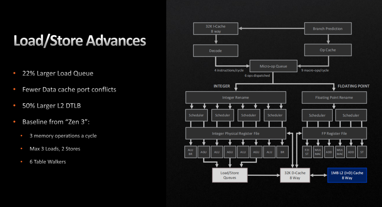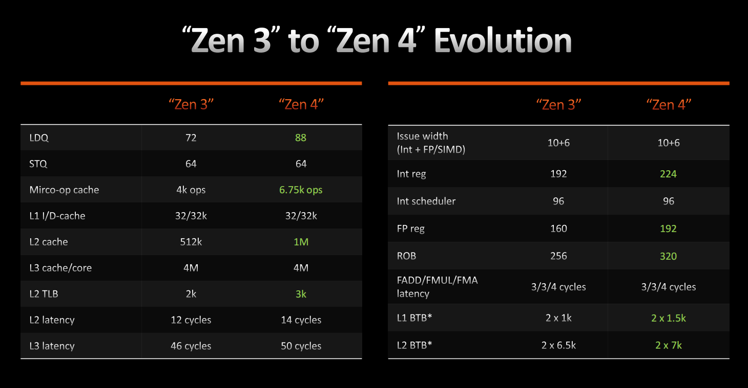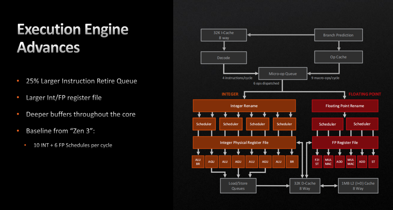 在前端部分,Zen4着重提升了分支预测,从Zen3的每周期1个升级到2个,分支目标缓冲区(BTB)也随之提升,L1 BTB增大了50%(2×1K升级到2×1.5K),L2 BTB也增加了近8%(2×6.5K升级到2×7K)。操作缓存(Op Cache)增加了68%,而且每周期可以执行9条宏操作(Zen3是8个)。在整数和浮点之间提供每周期6条操作。