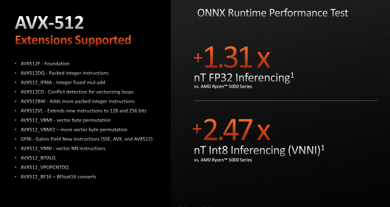 Zen4新加入对AVX-512的支持是大家比较关注的点,从官方数据来看,和Zen3相比,在支持AVX-512的ONNX运行时性能测试中,Zen4的多线程FP32浮点性能可提升131%,多线程Int8整数性能可提升247%。而且,Zen4处理器在执行AVX-512指令集的时候不会降频(不会像Intel处理器那样需要一个较低的AVX-512 offset频率来保证不会过热),这也是5nm先进工艺带来的高能效比红利。