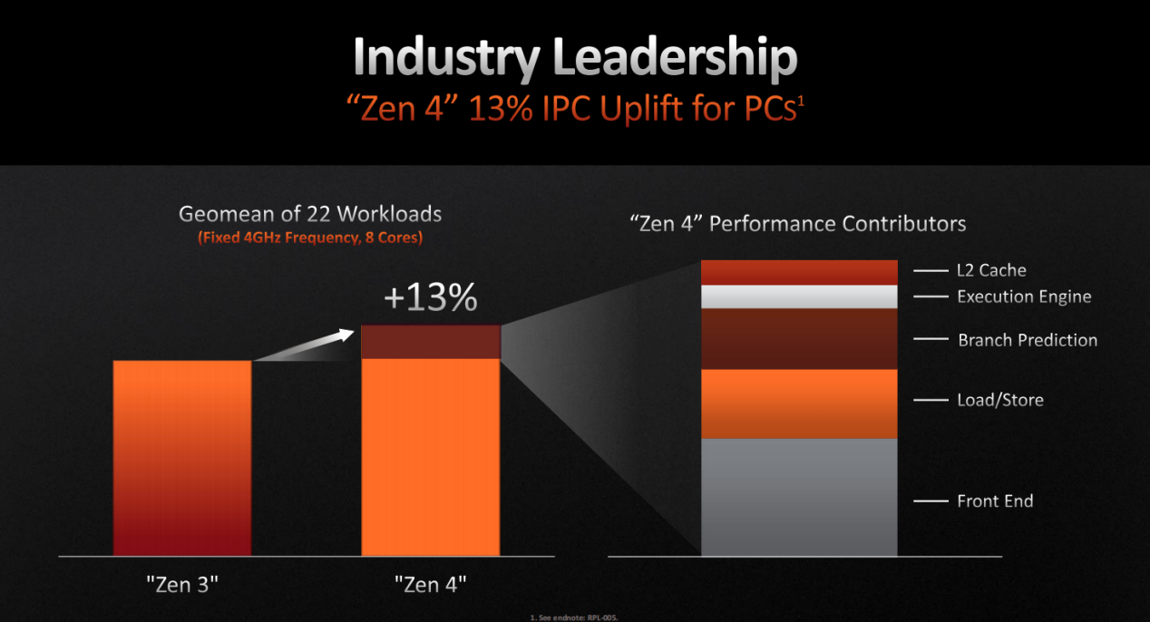 那么Zen4架构这样的改进带来了多少性能提升呢?从官方提供的数据来看,同为4GHz频率情况下,Zen4的IPC提升了13%之多,而从右边的示意图可以看到,Zen4微架构前端的改进带来的性能收益比例最高,其次是载入/存储部分和分支预测部分,最后是容量翻倍的二级缓存和执行引擎。