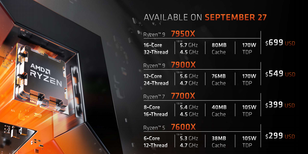 而且,在首发价格方面,4款锐龙7000处理器分别定价5499元、4299元、2999元和2249元,相对上代对位的锐龙9 5950X、锐龙9 5900X和锐龙7 5800X分别下调了550元、200元和200元,这也算是让利给消费者了,相比竞品涨价的操作可以说是太有诚意了。